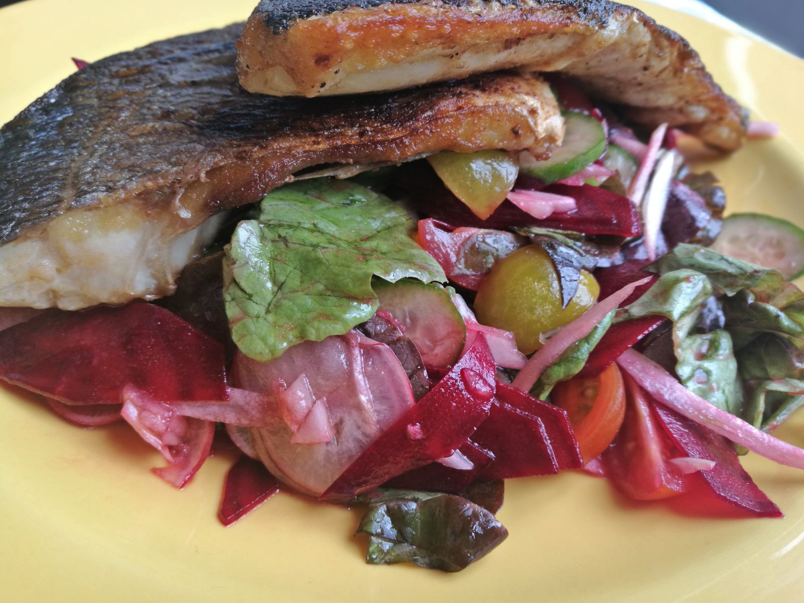 Normalmente, coloco a salada e por cima os filetes, como está na foto.